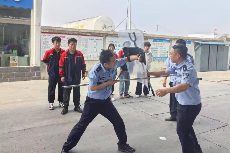 在全面做好安全隐患排查工作的同时,民警还对员工进行了反恐防暴培训,现场指导他们反恐防暴器具的使用和操作流程, 并模拟违法犯罪分子趁乱抢劫加油站和外地联合收割机驾驶员等突发事件,开展应急处置演练。