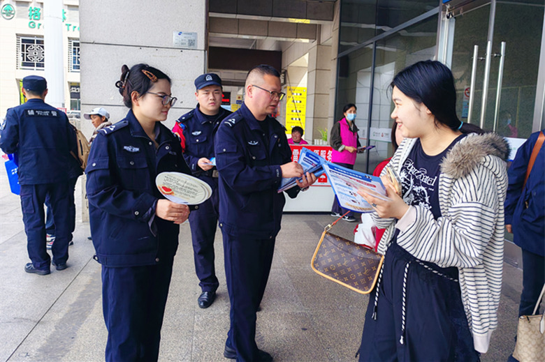 在高铁宿州东站广场,宣传民警辅警通过悬挂标语横幅、发放宣传彩页等形式向过往乘客和广大市民宣传网络安全知识,指导他们在日常工作中如何提高防谍意识和反恐反邪意识;在日常生活如何正确使用手机、如何保护个人隐私、如何预防网络诈骗等。