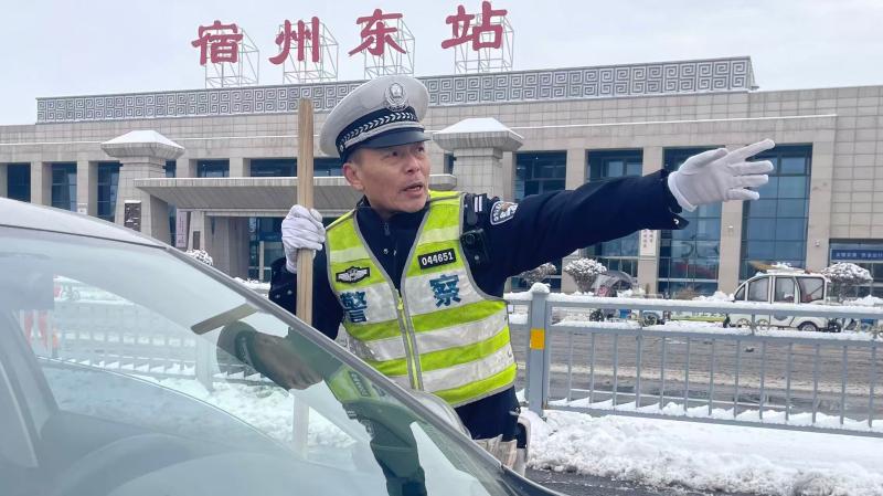 宿州交管支队宿马大队增派警力,加强路面巡逻与交通疏导,在关键路口冒雪指挥,守护道路安全。