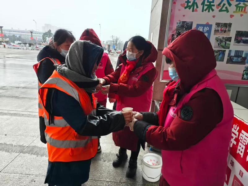 宿马园区志愿服务大队在站前广场等重点区域撒盐除冰、帮扶旅客,并向来往旅客、户外工作者免费提供姜枣茶,传递冬日温情。